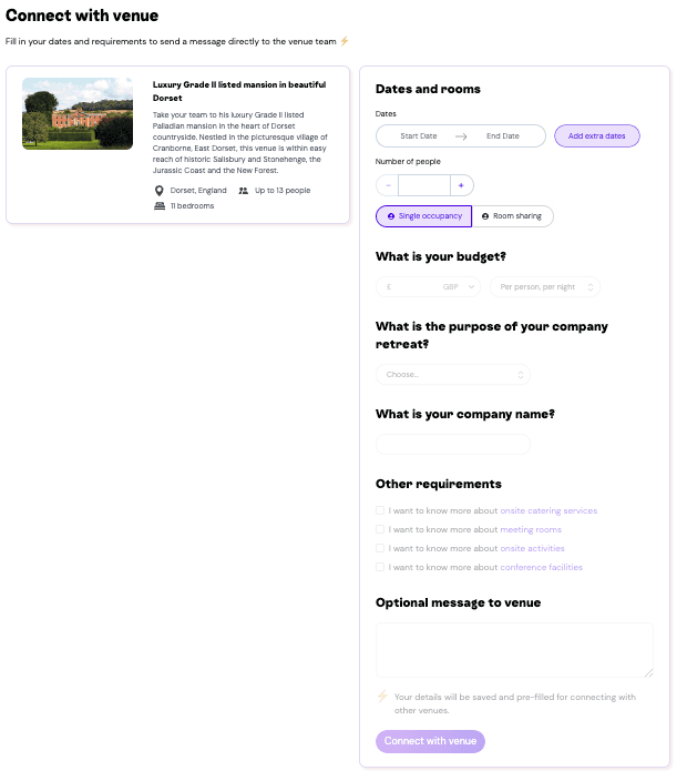 Our platform offers a curated selection of retreat-ready venues, including inspiring hotels, cosy cabins, working farms, and wellness spas — all handpicked by us. You can message venues before booking and use Basejam to easily create a custom retreat experience that meets your team's needs.