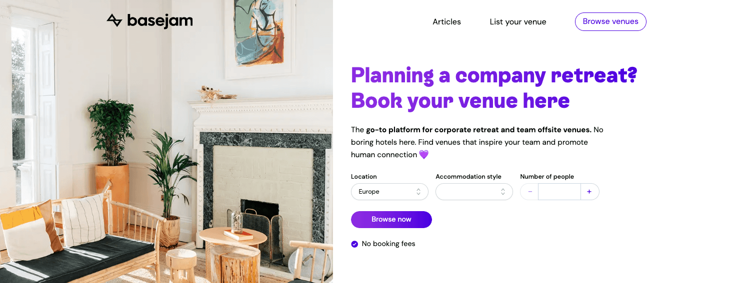 Basejam makes finding and booking a venue for your team retreat a breeze. Browse our curated and searchable database to find the ideal offsite venue. Then send venue enquiries in a couple of clicks. Alternatively, if you need help with full-service retreat planning, sign up for free.